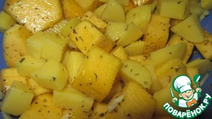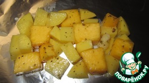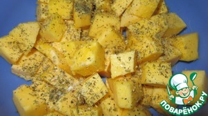 Картофель чистим и режем кубиками, по размеру примерно в два раза меньше тыквенных брусочков.