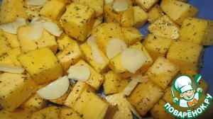 Чеснок режем тонкими пластинками и добавляем к тыкве. Откладываем 2/3 тыквенно-чесночной смеси в сторону. Собственно, это и есть гарнир для худеющих.