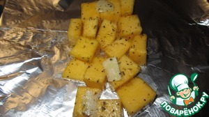 Далее нам понадобится 8 кусков фольги размером примерно 30х20 см, по два на каждую порцию. Начнём с низкокалорийных порций. Выкладываем на фольгу в форме прямоугольника слой тыквенно-чесночной смеси.