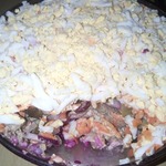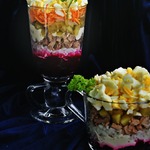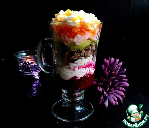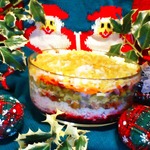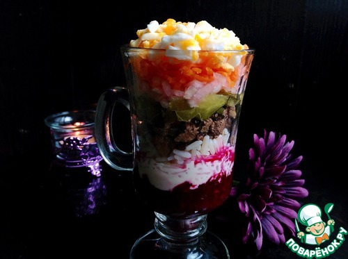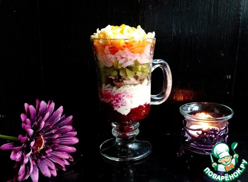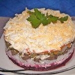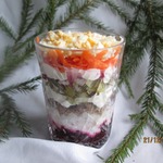 Если в большом салатнике делать, то стараюсь чтобы все слои попались при накладывании в порционную тарелку, потом опять же перемешиваю и только потом ем.