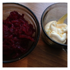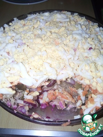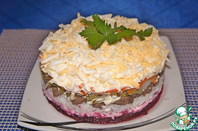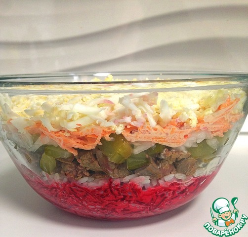 Отварную свеклу очистить и натереть на крупной терке. К майонезу добавить чеснок, пропущенный через пресс. Замаринованный лук откинуть на дуршлаг и дать стечь лишней жидкости. Готовую печенку можно нарезать более маленькими кубиками. Собрать салат слоями: