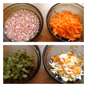 Лук нарезать как можно более мелкими кубиками и замариновать минут на 15: к половине стакана охлажденной воды добавить соль, сахар и уксус, выложить в маринад лук. Сырую морковь натереть на крупной терке так же, как и яйцо. Маринованные огурцы нарезать маленькими кубиками.