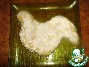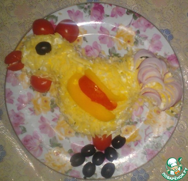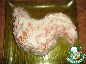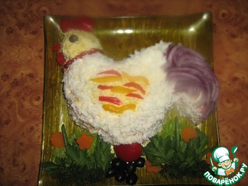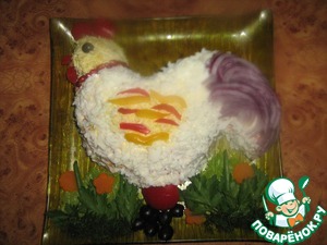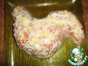 Картофель сварить, почистить. Натереть на крупной терке. Уложить в форме петуха. Посолить. Смазать майонезом.