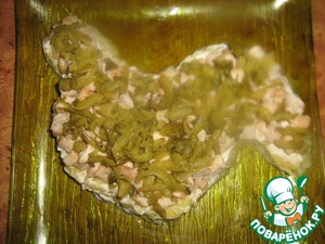 Соленые огурцы порезать на крупную терку, уложить слоем.