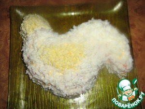 Сварить яйца. Белок потереть на средней терке, желток - отдельно. Засыпать желтком "голову и крыло". Белком "туловище".