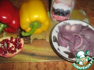 Подготовить ингредиенты для украшения: перец красного и желтого цветов, маслины, красную луковицу - разрезать на половинки и мелко порезать полукольцами. Зерна граната.