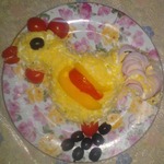 УКРАСИТЬ " голову и крыло" посередине засыпать желтком, "туловище" - белком. На "хвост" наложить тонкие полукольца красного салатного лука. Сделать "гребень, сережки, клюв, перья, ножку" из красного сладкого перца. Желтый перец - "перья". "Глаз, кожа на ножке" - кусочки маслин. Украсить "головку петуха" гранатом.