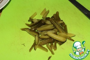 Нарезать также полосочками соленые огурцы. Брать 3-4 штуки, в зависимости от размера. У меня в этот раз были маленькие.