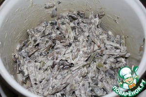 Теперь пришло время соединить все ингредиенты, но сначала отложим немного печеночных палочек на украшение салата. Остальную печень смешать с грибами и огурцами. Заправить майонезом (количество на свое усмотрение, но в оригинале его должно быть много).