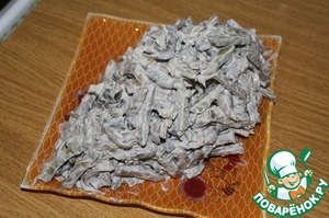 Когда печень сварится, охладить её и нарезать полосочками.