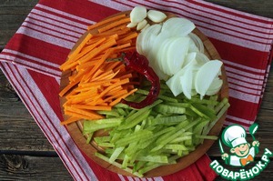 Морковь и редьку нарезаем соломкой. Лук полукольцами, чеснок мелко рубим.