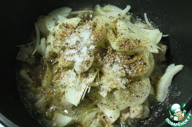 Далее добавляем лук и специи для лагмана, жарить еще около 2 минут.