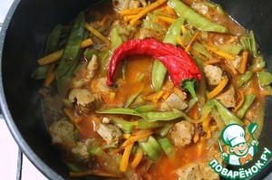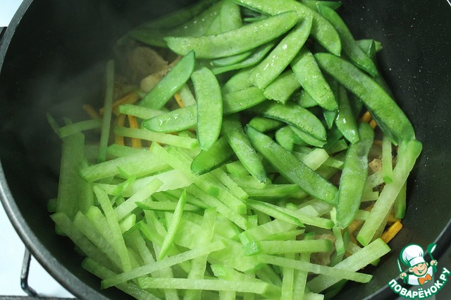 Следом добавляем редьку и стручки зеленого горошка. Тушим под крышкой минут 5.