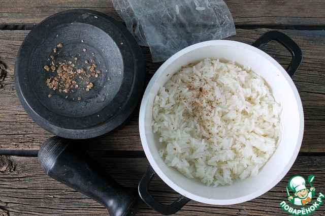 Готовый рис перекладываем в кастрюлю, приправляем измельченным кориандром, накрываем крышкой.