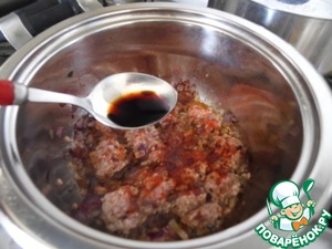 Добавьте фарш, чеснок, паприку, соевый соус, и обжаривайте минут 5