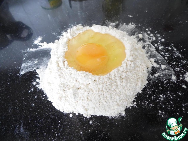 можно не добавлять всю муку сразу, оставить чуть-чуть и добавить её в конце завешивания, если будет нужно. муку высыпать горкой, сделать в центре углубление. добавить яйцо в это углубление. Туда же добавить немного соли и оливкового масла, -