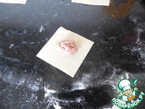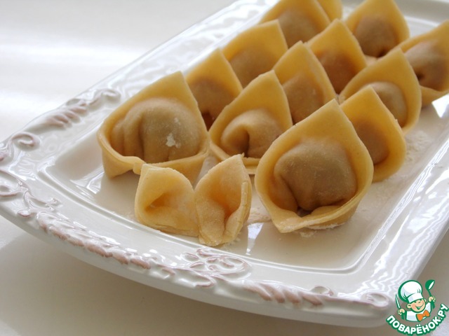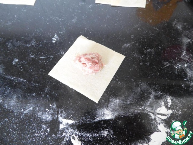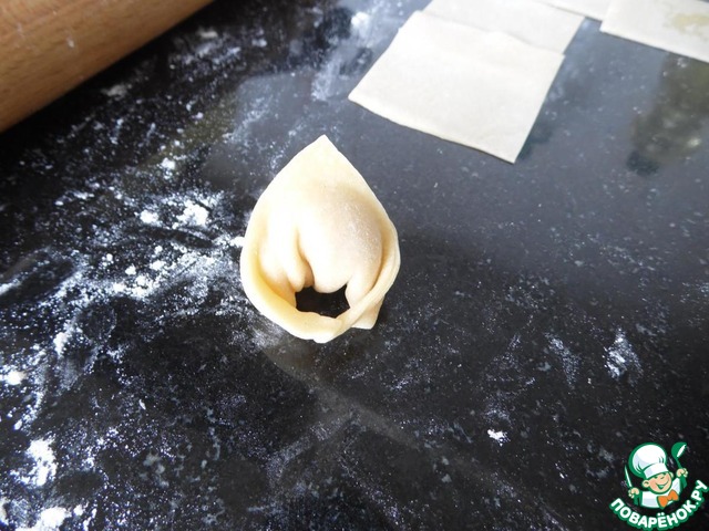Лучше не припылять большим количеством муки доску и скалку, т. к. с лишней мукой тесто начинает терять влагу и становится менее эластичным. Толщина теста для тортеллини должна быть меньше 1 мм, тесто должно быть очень тонким и просвечивать. Раскатать нарезать квадраты, Брать каждый квадратик, класть на него немного начинки,