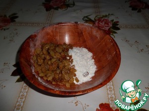Распаренный изюм обсушиваем, выкладываем в чашку и добавляем немного муки. Перемешиваем.