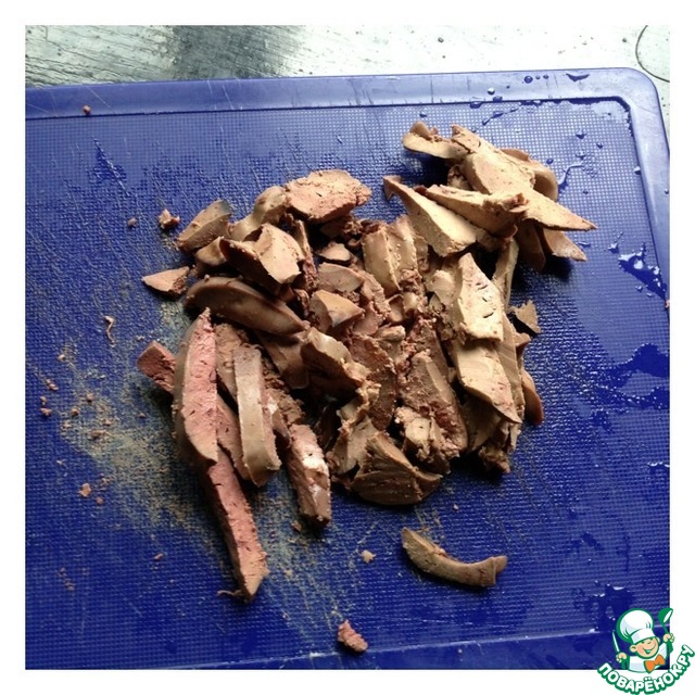 Куриную печень отварить в подсоленой воде буквально 7-10 минут. Остудить. Нарезать соломкой.