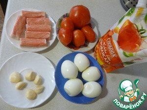 Помидоры, крабовые палочки, яйца. Чеснок добавляем в последнюю очередь.
