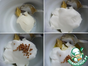 Готовим соус. В чашечке смешать горчицу, сливочный сыр, сметану, зерна горчицы, оливковое масло.