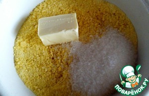 • Кукурузные хлопья измельчить. Смешать с 40 г сахарного песка, мягким маслом и 2-3 ст. ложками воды. Это наше тесто.