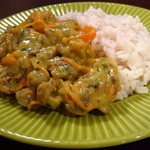 В сковороду наливаю пару ложек масла и обжариваю лук минут пять. Затем добавляю к луку морковь и обжариваю до "почти мягкости", то есть морковь должна быть мягкая, но не совсем готовая. Минут 10. За минуту до того, как выключить, в сковородку добавляю мелко нарезанный чеснок и пол ложки молотого кориандра.
