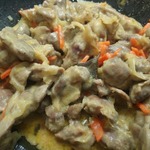Когда желудочки стали мягкими, а жидкость практически выпарилась, добавляю к ним зажарку, столовую ложку муки и пару чайных ложек "прованских трав". Можно и поперчить (я перец не добавляю). Хорошенько перемешиваю. Затем вливаю в кастрюльку два стакана молока. Солим по вкусу. После закипания тушу минут десять.