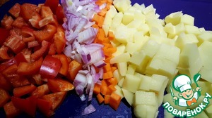 Овощи, кроме брокколи нарезать кубиком, лук и морковь помельче, перец, как Вам нравится и картофель средним кубиком.