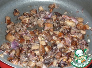 В сковороду наливаем 2 ст. л. растительного масла. Выкладываем лук и грибы (я использовала замороженные ). Солим.
