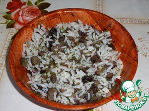 Готовим начинку. В чашку выкладываем отварной рис, обжаренные грибы и зелень.
