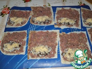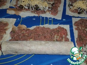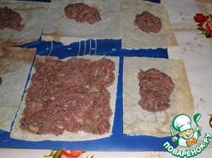 На каждый прямоугольник лаваша выкладываем подготовленный мясной фарш.