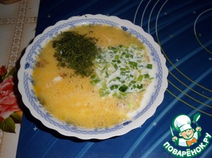 Готовим соус : в чашку разбиваем 2 яйца. Добавляем соль. Хорошо взбиваем. Добавляем молоко и нарезанную зелень. Еще раз хорошо взбиваем.