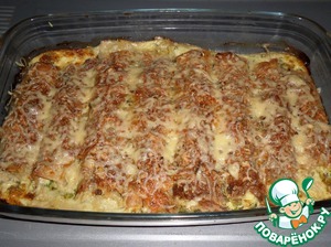 Посыпаем оставшимся сыром. Ставим форму с рулетиками в разогретую духовку.