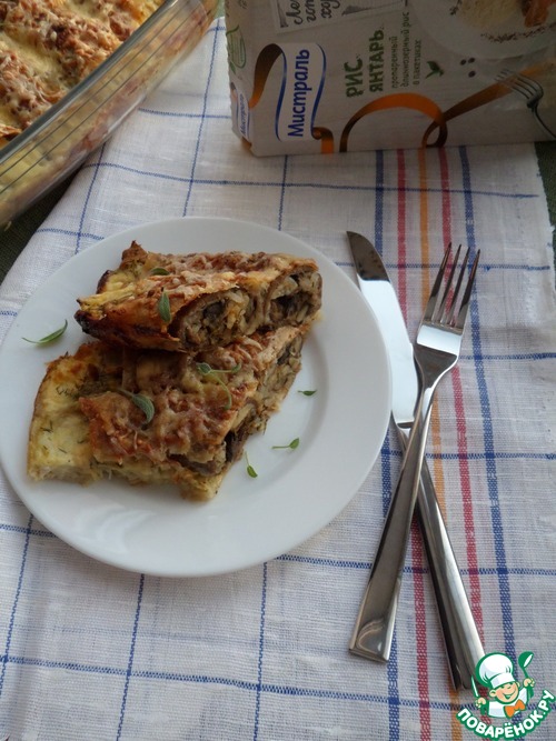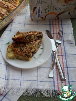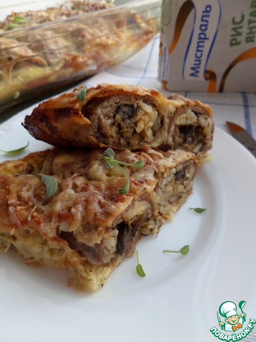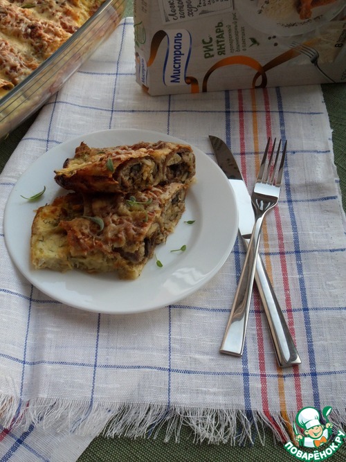 Поверх мясного фарша выкладываем рисово-грибную начинку.