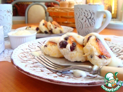 Раскладываем по тарелкам. Для подачи я соединила натуральный йогурт с абрикосовым повидлом и полила сырники.