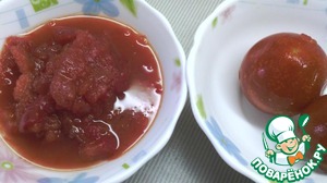 Протереть мякоть помидоров через сито. Если пюре получилось слишком густым - можно добавить рассол.