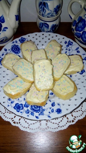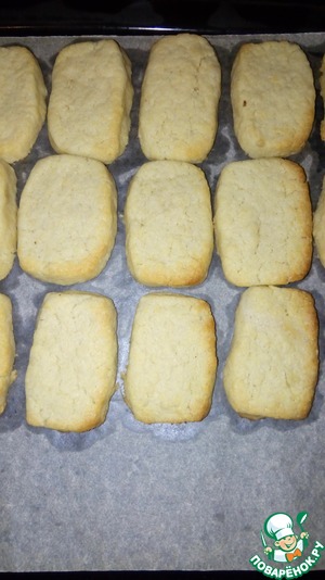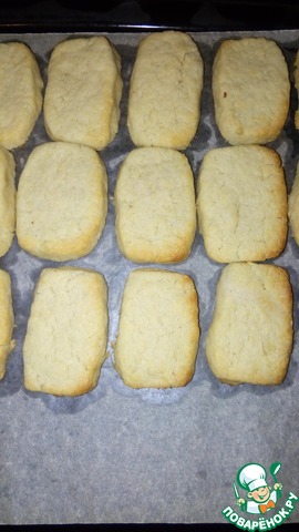 Выложить прямоугольники на выстланный бумагой для вытекания противень. Готовить 10 -12 минут до золотистого цвета. Остудить на решётке.
