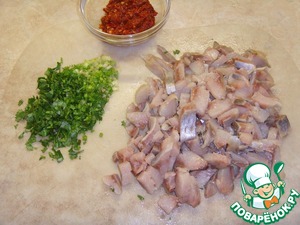 Зелень мелко порубить. Селёдку порезать небольшими кусочками.