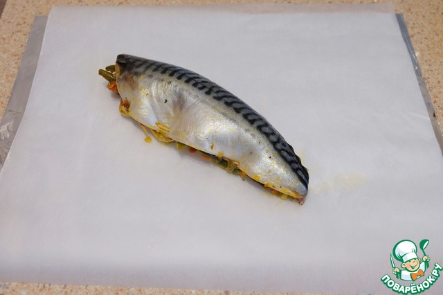 На слой фольги выложить слой пекарской бумаги. На середину выложить нафаршированную овощной смесью тушку скумбрии.