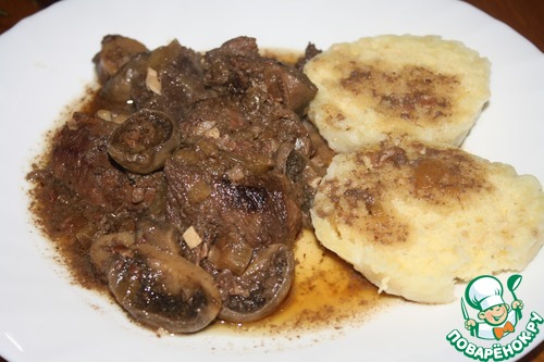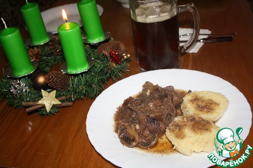 Я подавала рагу с кнедликами. Рецепт как делать кнедлики здесь. Единственно свои я в воде отваривала 25 мин.
