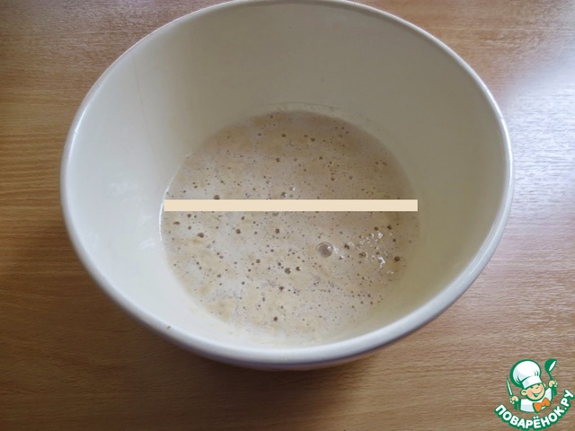 В 150 граммах теплой воды (35-37 градусов) развести дрожжи, добавить 1 ст. л. сахара перемешать, просеять 2 ст. л. муки и снова перемешать, чтобы не было комочков, накрыть и оставить на 20 минут. Опара должна подняться, увеличиться в объеме и после того как она начнет опускаться и на поверхности появляются трещинки, она готова