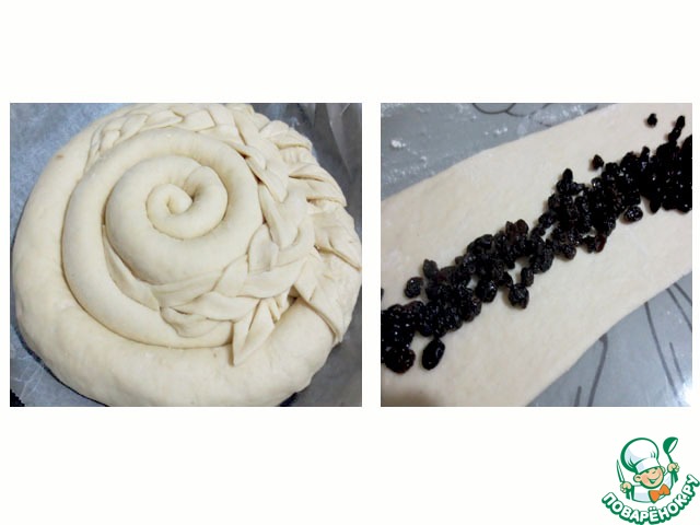 Готовое тесто обмять, разделить на 2 части. Из каждой части раскатать полоски, шириной 10 см, длиной 50 см. В середину положить заранее промытый и обсущенный изюм, залепить концы.