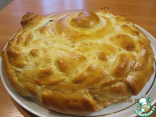 После того как пирог сформирован, смазываем его поверхность взбитым желтком, оставляем на 15 минут и затем выпекаем в предварительно разогретой до 180-190 градусов духовке 30 минут.