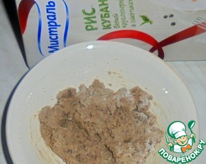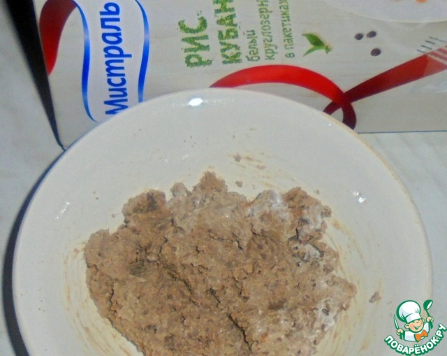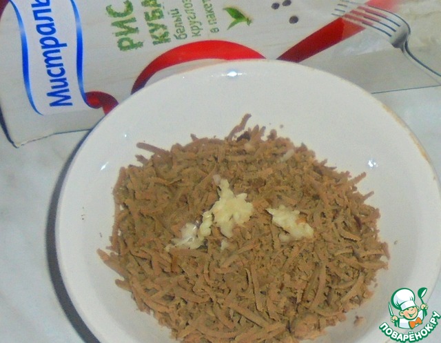 Печень и рис в пакетике отвариваем заранее. Даем остыть, а затем натираем печень на мелкой терке. Добавляем половину чеснока и солим. Перемешиваем.