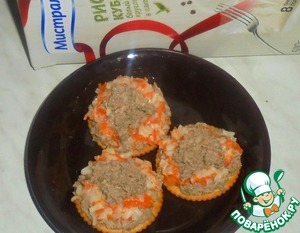 Берем крекер и кладем слой из печени, затем рис с морковью и снова печень.