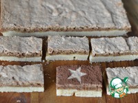 Полностью остудить. Придадим пирожным соответствующую форму. Разрежем на произвольные кусочки, как вам нравится. Сверху присыпать какао. Можно использовать трафарет. |