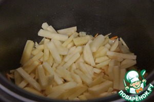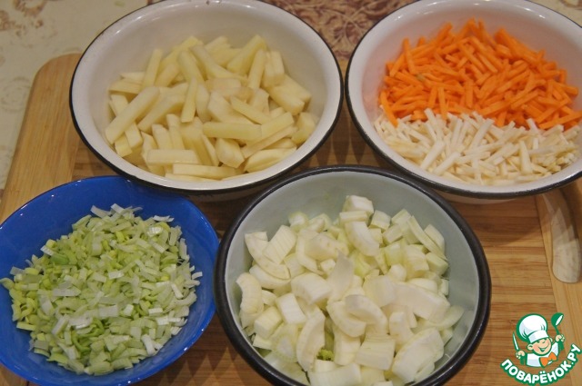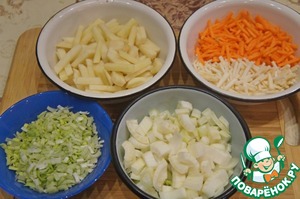 Овощи вымыть, очистить и нарезать: морковь и корень сельдерея - тонкой соломкой, картофель - брусочками.
