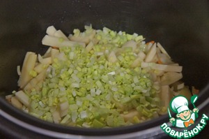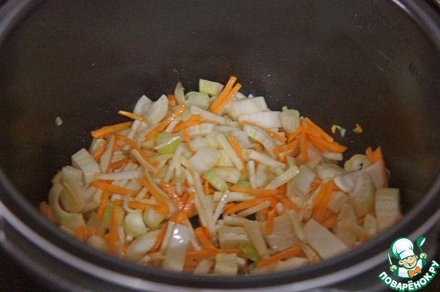 В чашу мультиварки налить растительное масло, выставить режим жарка и, помешивая, обжарить морковь, сельдерей и фенхель в течение 5 минут.