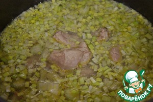 Бульон довести до кипения, засыпать картофель, снова довести до кипения и варить на маленьком огне 10 минут, затем посолить, добавить зажарку и лук-порей и варить еще 5 минут.